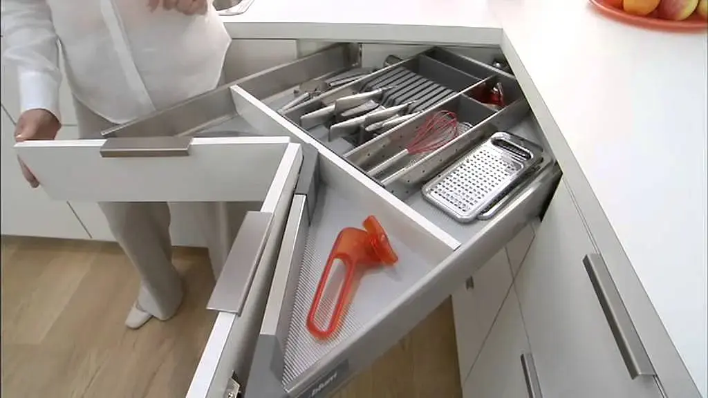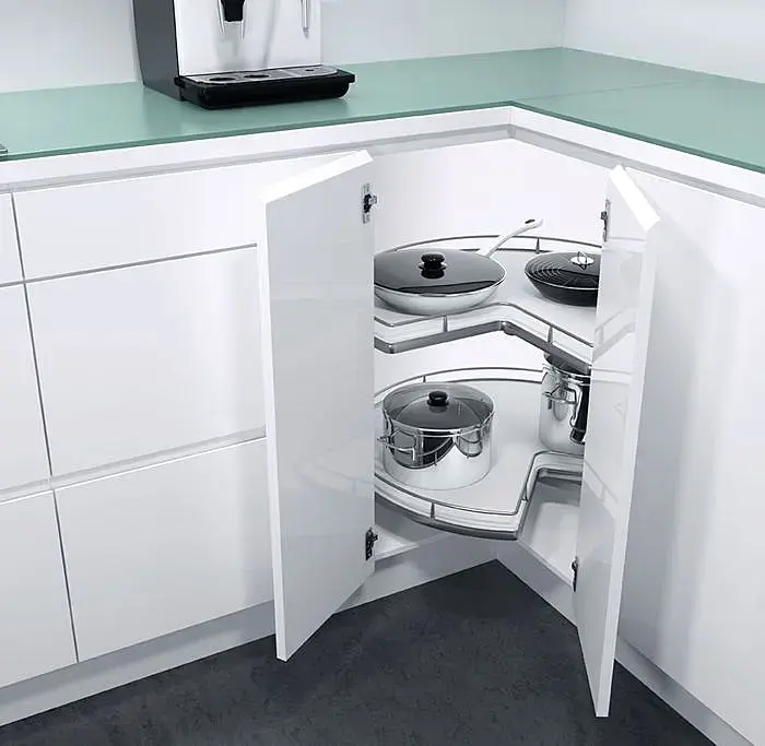 Кстати, подобная угловая фурнитура стоит прилично лишних денег, потому что всё это нестандарт, а удобство её использования и вместительность не всегда оправдывают вложений. Надо слишком сильно любить вращающиеся кастрюльки с подсветкой ))))