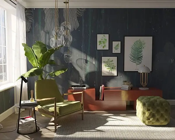Я бы убрал весь декор мебель, настроил нормально ракурс -возможно сменил формат на более горизонтальный, перевел изображение в сермат и настраивал бы свет за окном, пока без фона, подключил бы скай к солнцу. все предметы мебели проверил бы на масштабность, согласно сущ моделям (не с 3ддд библиотеки, а с каталогов) и постепенно добавлял бы предметы мебели, люстру, декор.
