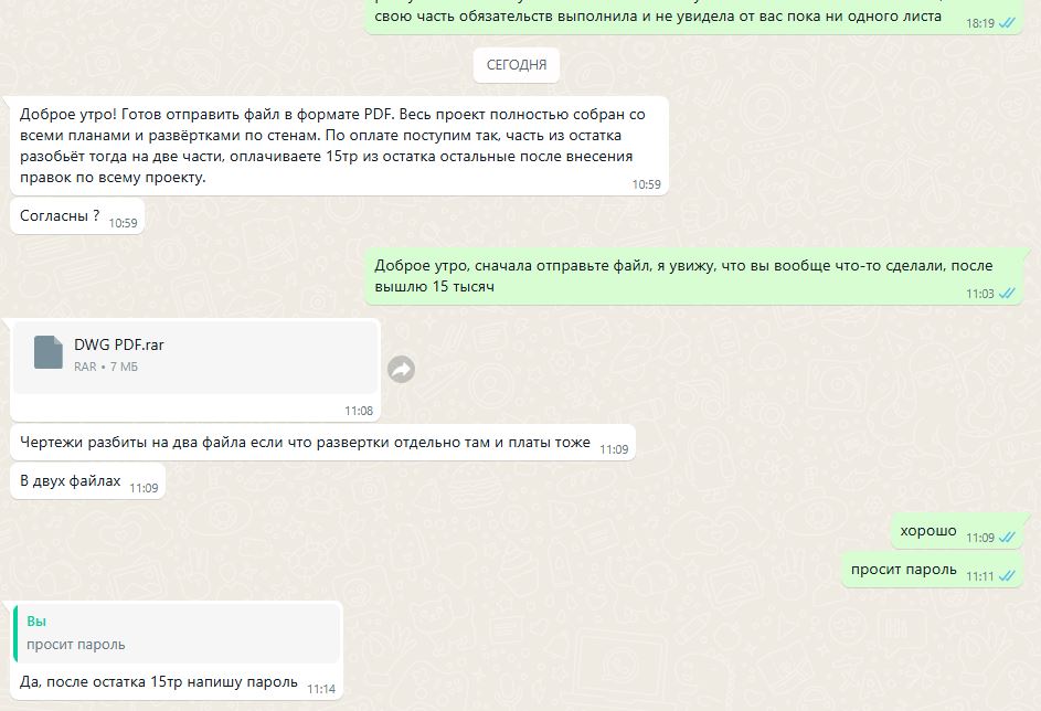 Это было бы прекрасно. Могу выслать подтверждающие документы, чек на аванс, ссылку на гуглдиск, что я ему на тз отправила, переписку, включая мои аудио ответы
