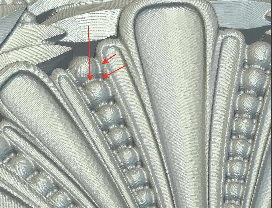Есть рельеф, хочу смоделировать результат после фрезерной обработки. Фреза коническая, с закруглённым концом. При обработке она выпуклые места проходит нормально, а на внутренних углах получаются радиусы. В некоторые места она вообще достать не может и там получаются сплошные непроработанные места