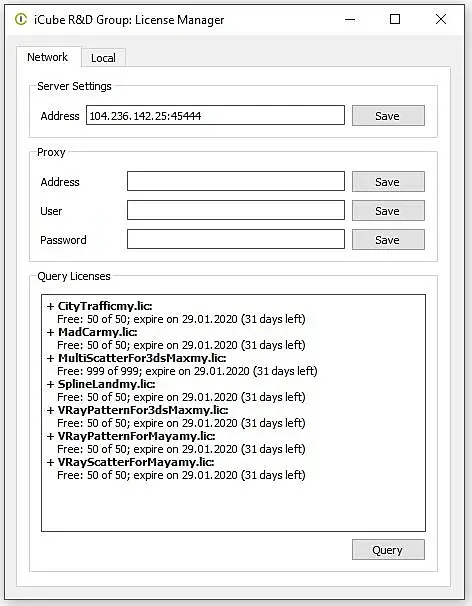 2. click on "Save" , and then "Query", the server should respond something like this(if Licence Manager crashes when you click Save, it means that server is not accessible, due to your firewall not allowing outgoing port 45444)