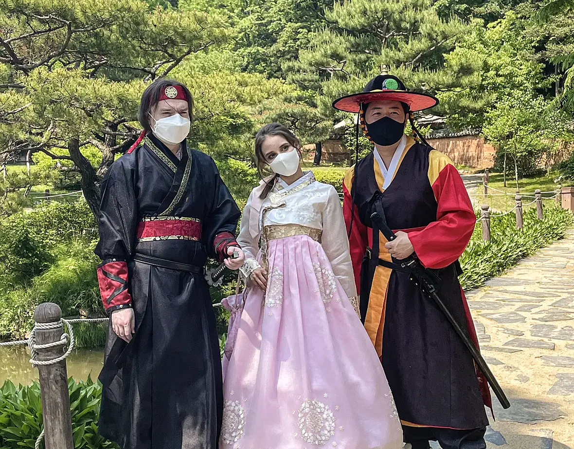 с друзьями на праздновании буддистского праздника в традиционных корейских костюмах