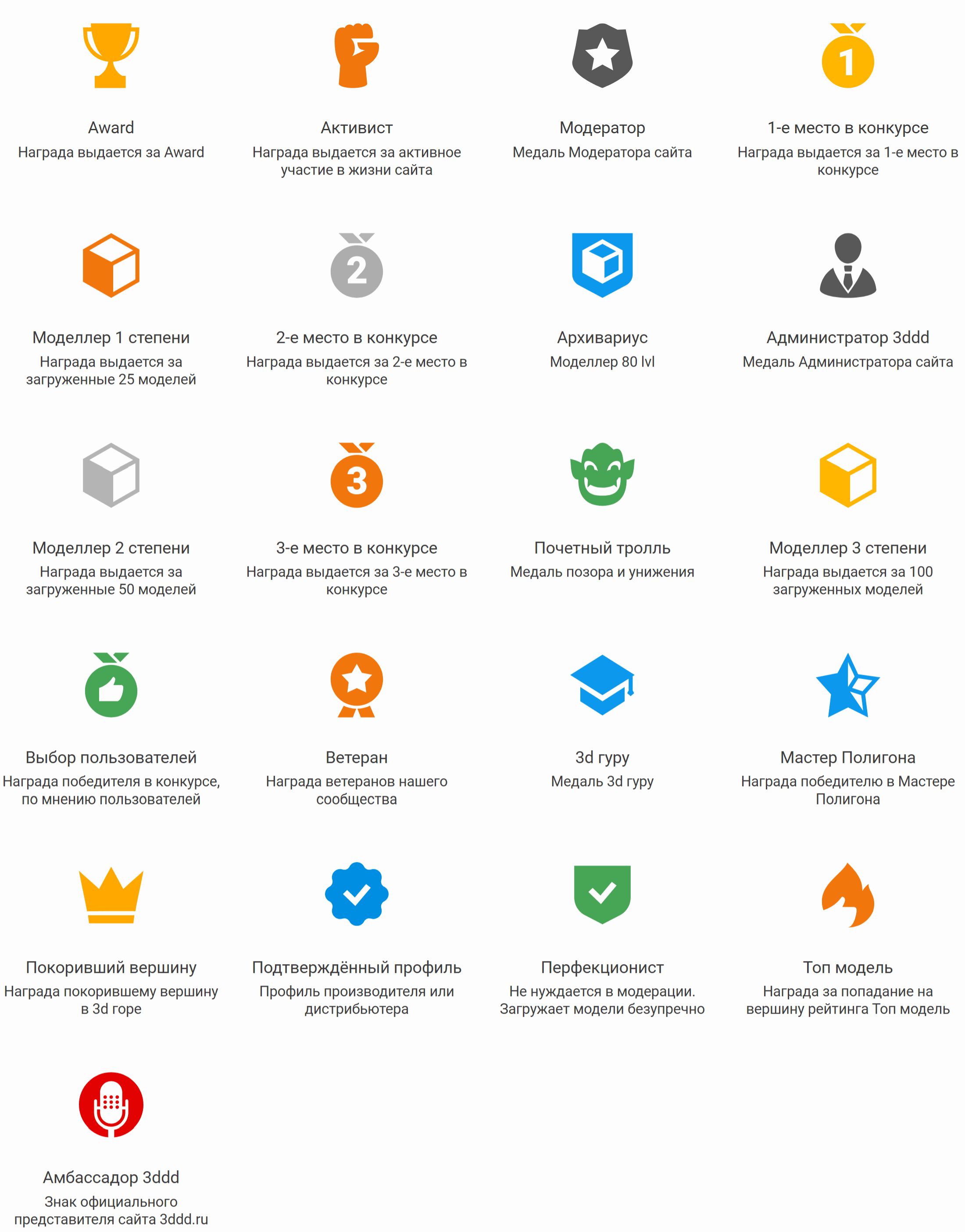 О, кстати насчет горы. Было бы неплохо как то позначать, за что именно дана медаль мастера полигона или царя, или авард. А то неясно, в профиле полно работ, моделей, а благодаря каким автор получил награды - неясно.
