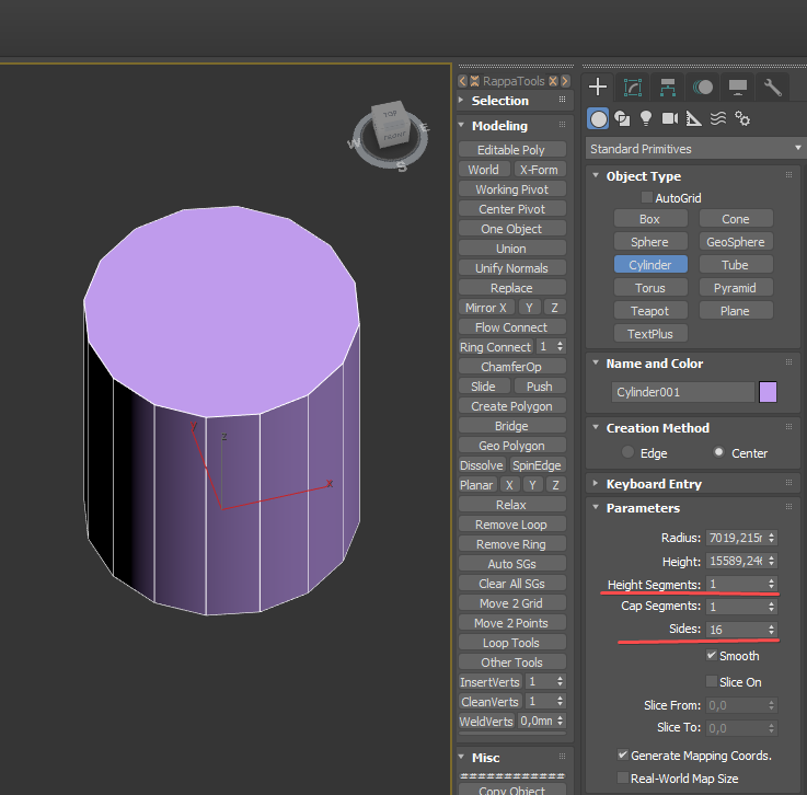 Допустим меня раздражает создание цилиндра с 18 сторонами и 5-ю сечениями по высоте - как это исправить? Очень просто - создаём цилиндр из панели create, переходим в командную панель и вызываем скрипт.