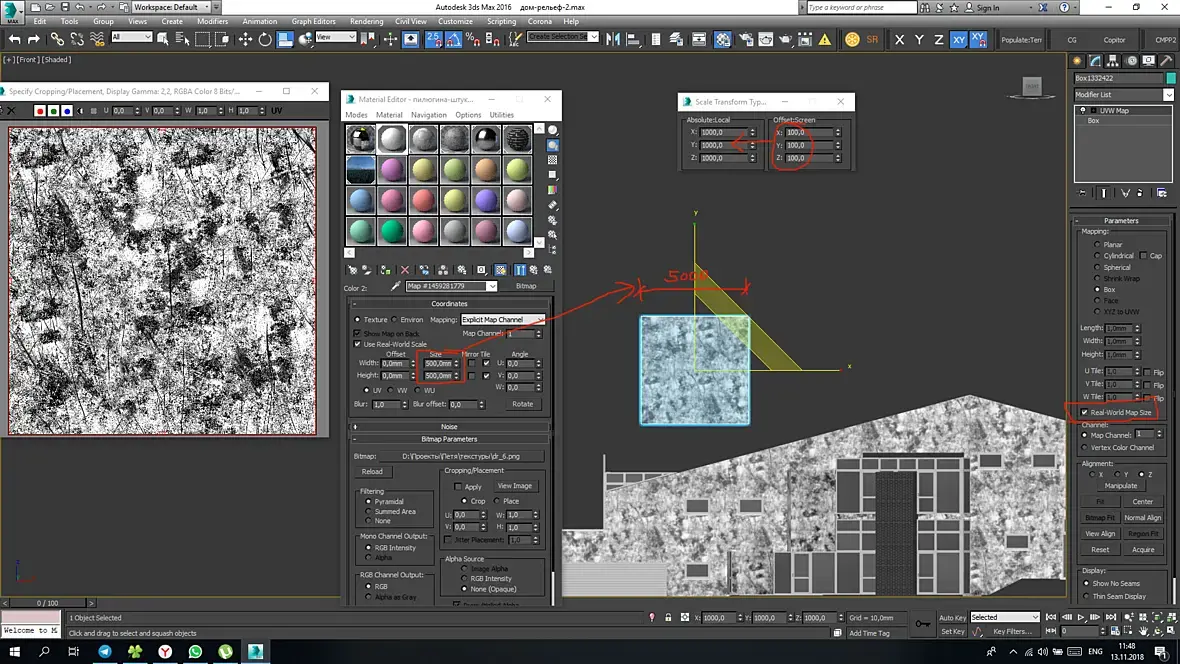 2) если задать текстуре размер 500*500, то на бокс текстура не ложится, приходится добавлять модификатор UVW Map и там ставить галочку Use Real-World Scale, в этом случае все идеально