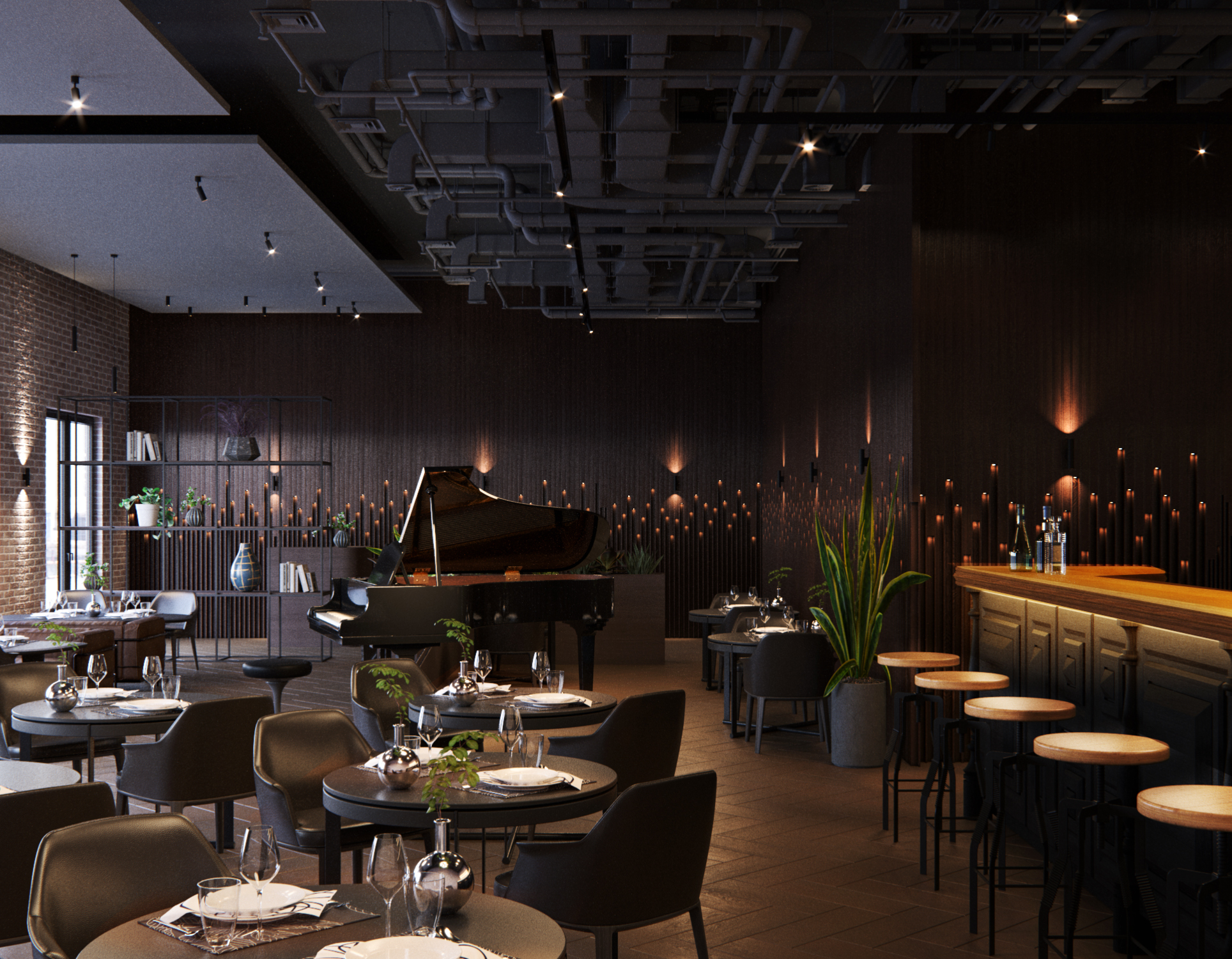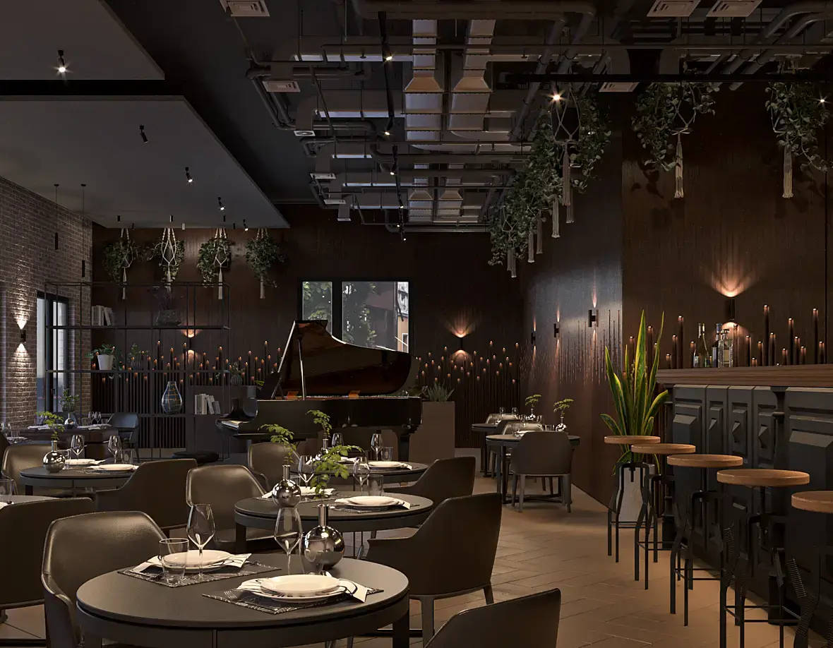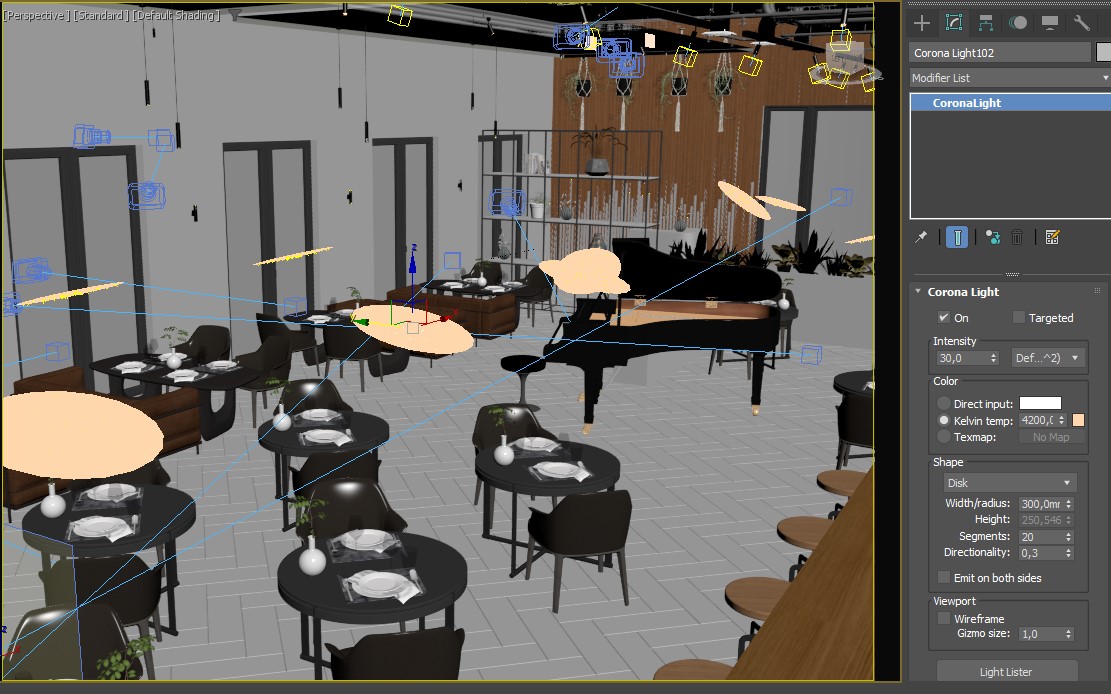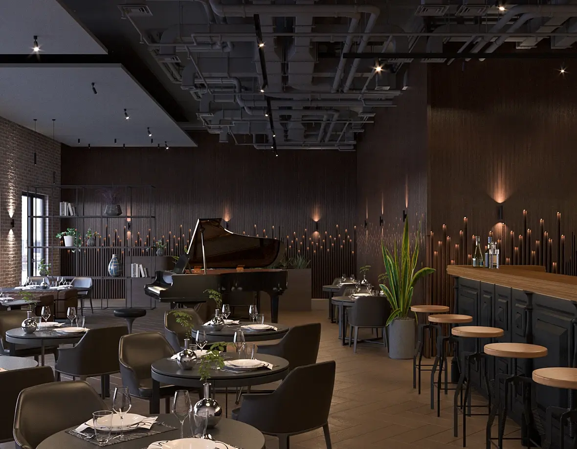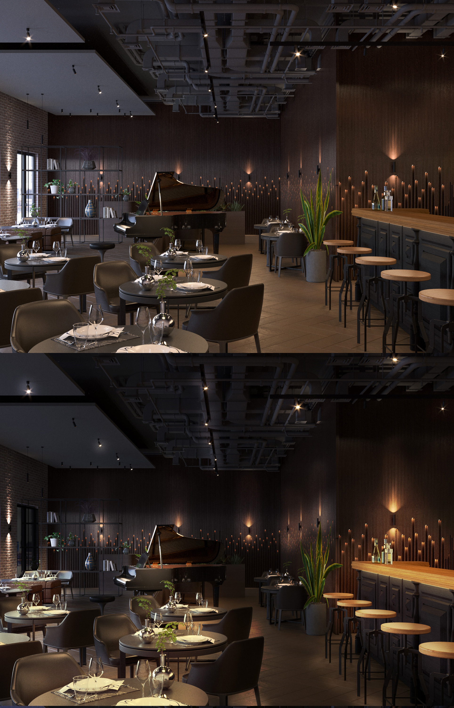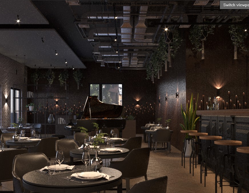Очень много источников света, прям через край. Каждый источник бьет достаточно сильно. То есть в некоторых местах естественный свет спорит с искусственным, световые пятна одинаковой насыщенности - это плохо.При этом форма, геометрия объектов не читается. Рояль превратился в черное пятно, а потолок притягивает к себе внимание своими отражениями, понятностью формы. Берите аналоги и повторяйте свет. Можете пробовать исключительно искусственный, можно дорабатывать этот вариант. Во 2-3 варианте естественный доминирует.