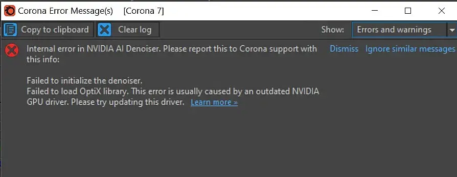 Давно работаю в короне и первый раз сталкиваюсь с такой проблемой. Обновил драйвер Nvidia (591.74) и диноиз полетел. Выходит такая ошибка