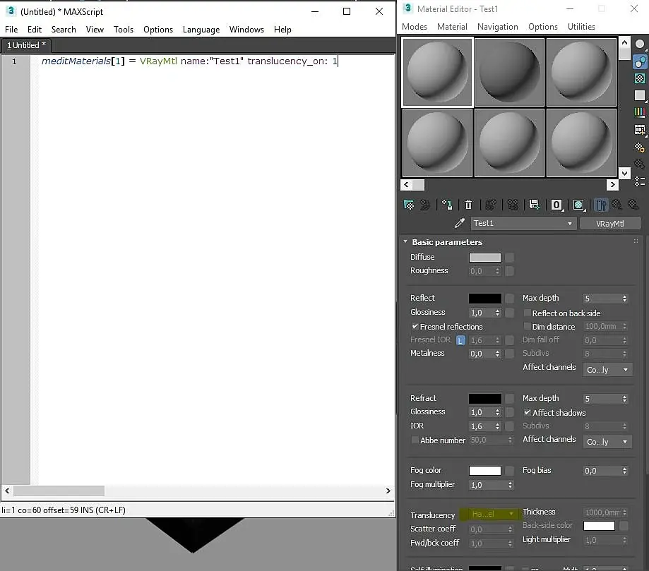 Можно принудительно попробовать проверить простой строкой: meditMaterials[1] = VRayMtl name:"Test1" translucency_on: 1 копируете и вставляете эту строку в розовое поле в нижнем, левом углу макса и нажимаете Enter. Эта строчка создает дефолтный материал вирея Test1 в первом слоте мат-эдитора (переключитесь в компактный режим из нодового) с включенной транслюценцией Hard(wax)