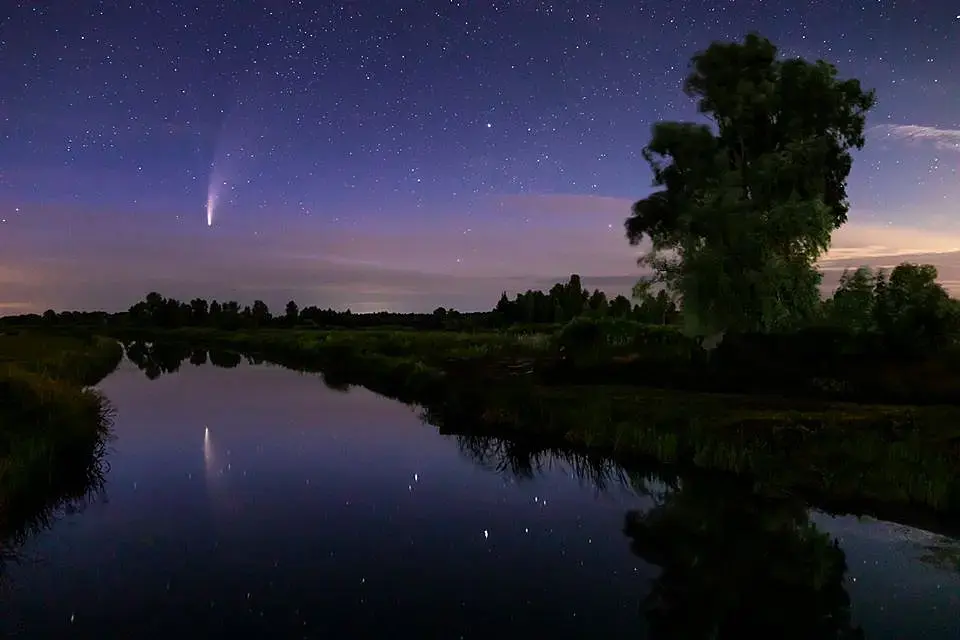 Есть такой фотограф Антон Петрусь. Он уже отснял целую серию с этой кометой. Вначале просто снимал ночные пейзажи с кометой, потом пошли постановки все с той же кометой. ))) Человек творческий, да еще и с шикарной техникой, не мог пройти мимо такого редкого явления. Фото сделаны возле Барышевки под Киевом