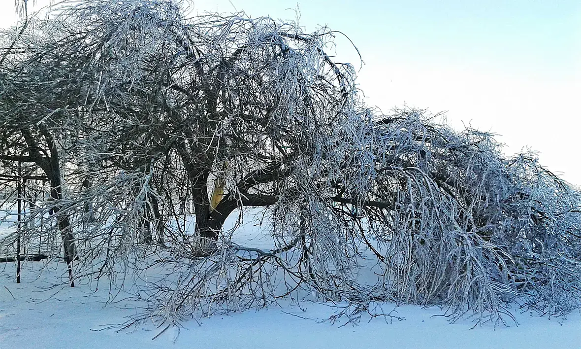 Вот это жёлтенькое на фото - свежий раскол дерева. А дерево - не ива, а шелковица. Вполне себе прямостоящее сильное и высокое дерево. Это его так льдом приплющило за ночь.