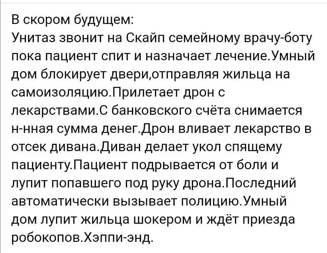На фразе "с банковского счета снимается н-ная сумма денег" можно все и закончить. Ибо откуда могут быть деньги на счету у живого человека, если везде работают боты и дроны?