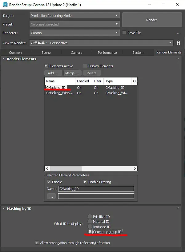 думаю это баг короны именно cmasking_id. Masking просто не пойдет, там 3 цвета всего.Нашел решение, там еще есть cmasking_wirecolor, она красит объект иги группу тем цветом, который назначишь в свойствах, можно хоть сколько назначать
