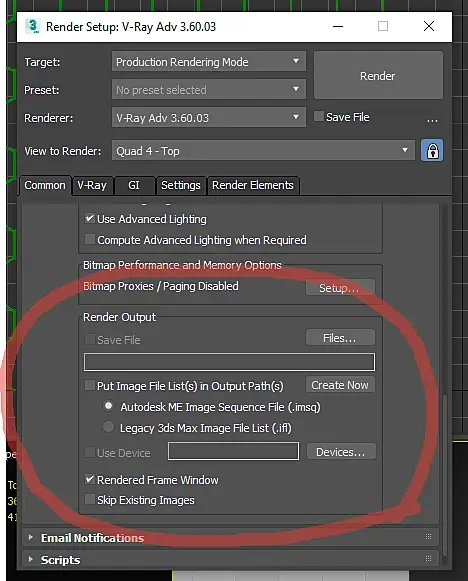 Заходим в настрой рендера F10.Во вкладке Common находим блок Render Output.Жмем по кнопке Files… и выбираем, куда сохранять рендер.Oбязательно выбираем формат файла (например, PNG) и жмем Save. После чего галочку Save File можно выключить, так как постоянно сохранять рендер автоматически, скорее всего, не нужно.