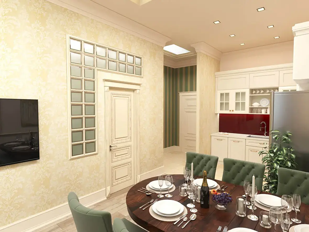 Меня больше смущает трехуровневый потолок. Особенно если рассматривать его как единственный источник освещения зоны в темное время суток... Треш. К тому же трехуровневые потолки устарели лет на 15.