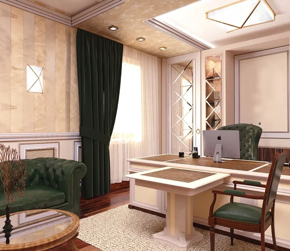 Посмотрел все ваши варианты и знаете что я понял? Помещение для кабинета маленькое и вам надо его визуально увеличивать: "раздвигать" стены с помощью светодиодной скрытой ленты, использование глянцевого МДФ, сделать всё светлым и воздушным пол и стену где герб одним цветом и прочие подобные махинации.