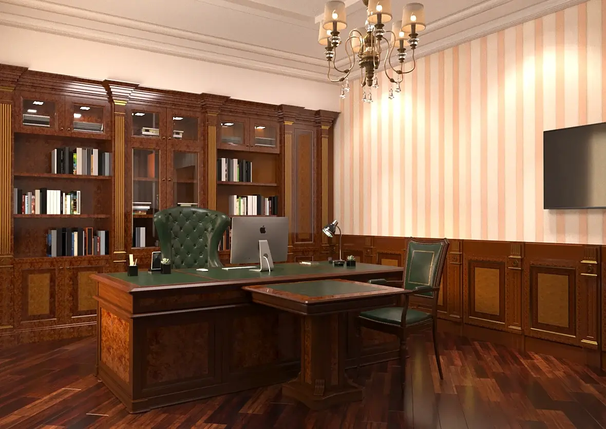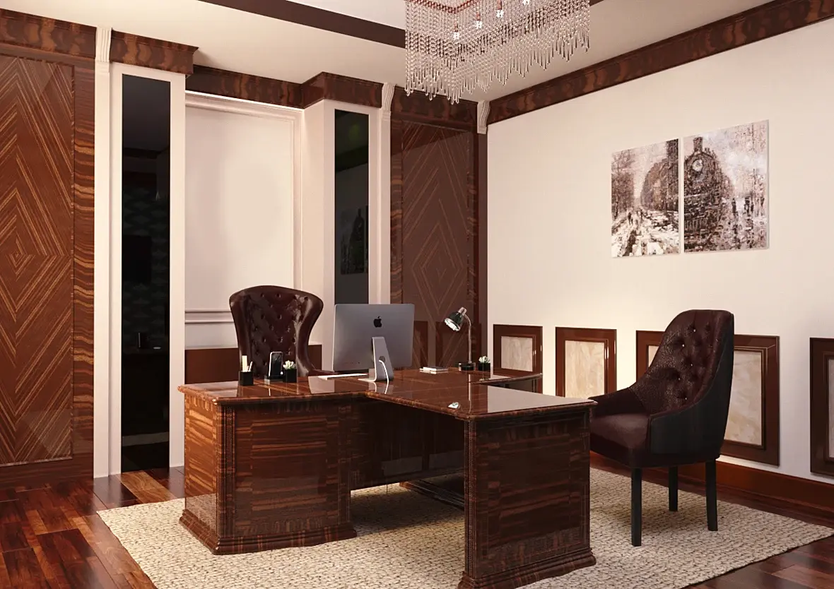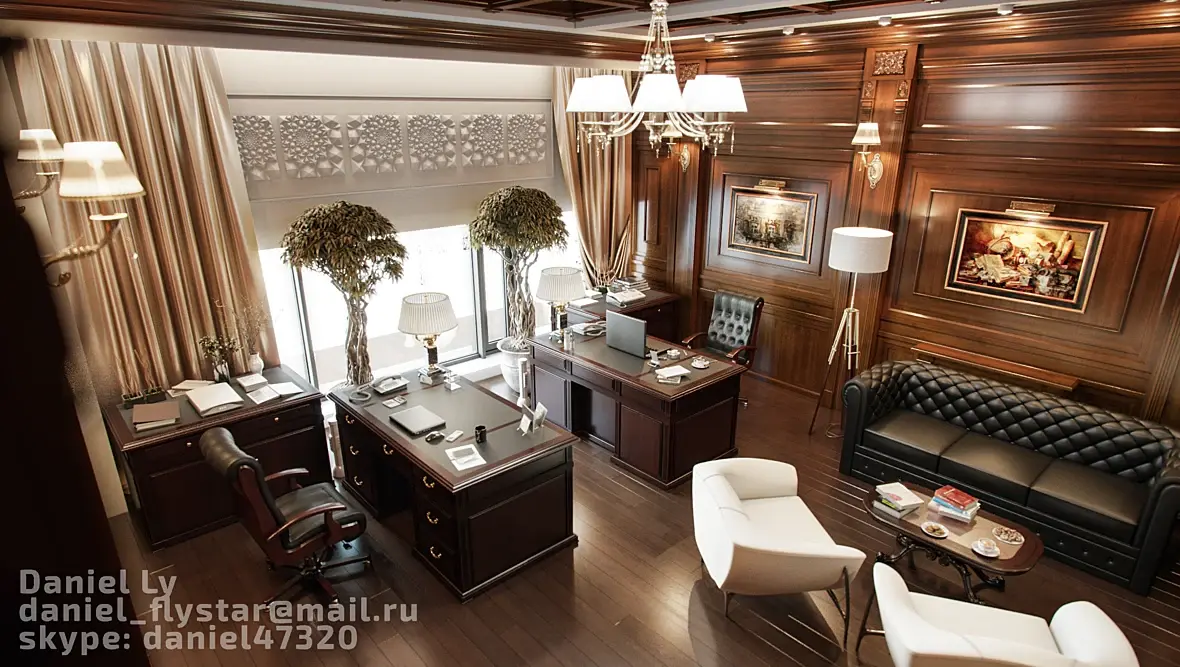 Вот мой пример, я делал дизайн кабинета для двух директоров, всем очень понравилось, может вам поможет. А вообще работу с заказчиком нужно начинать с аналогов, нужно полистать журналы и пусть определится со стилем. иначе это доение козла получается.