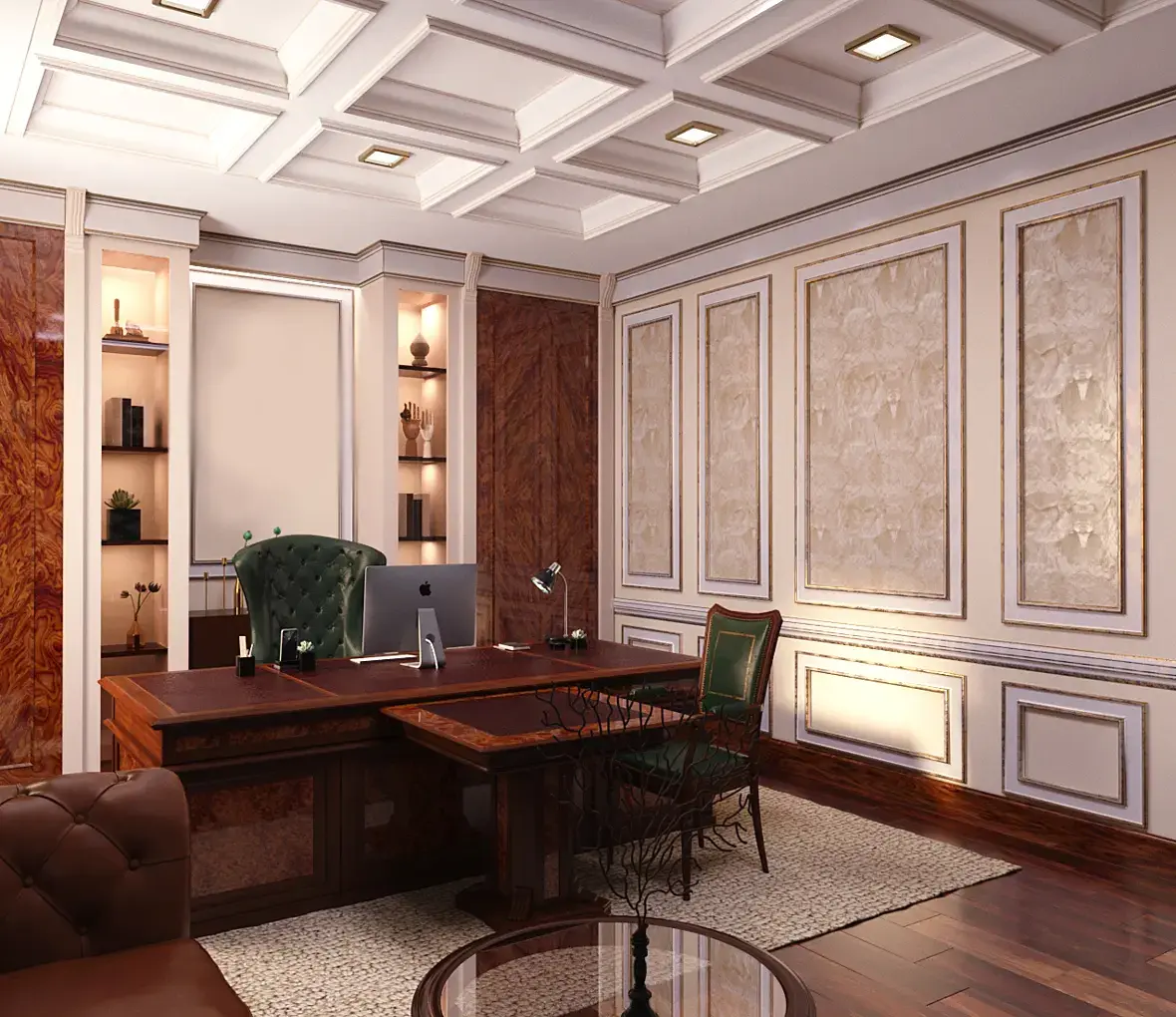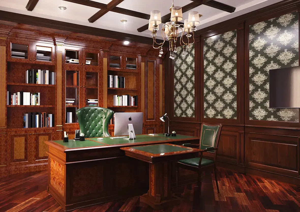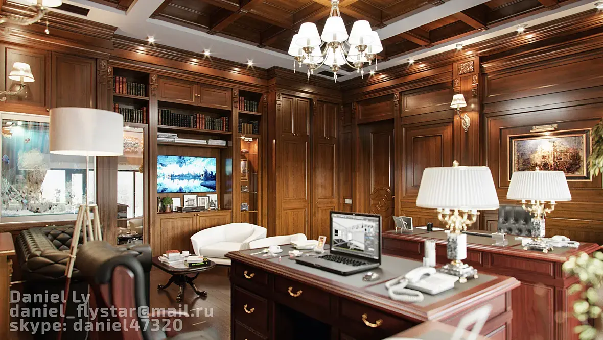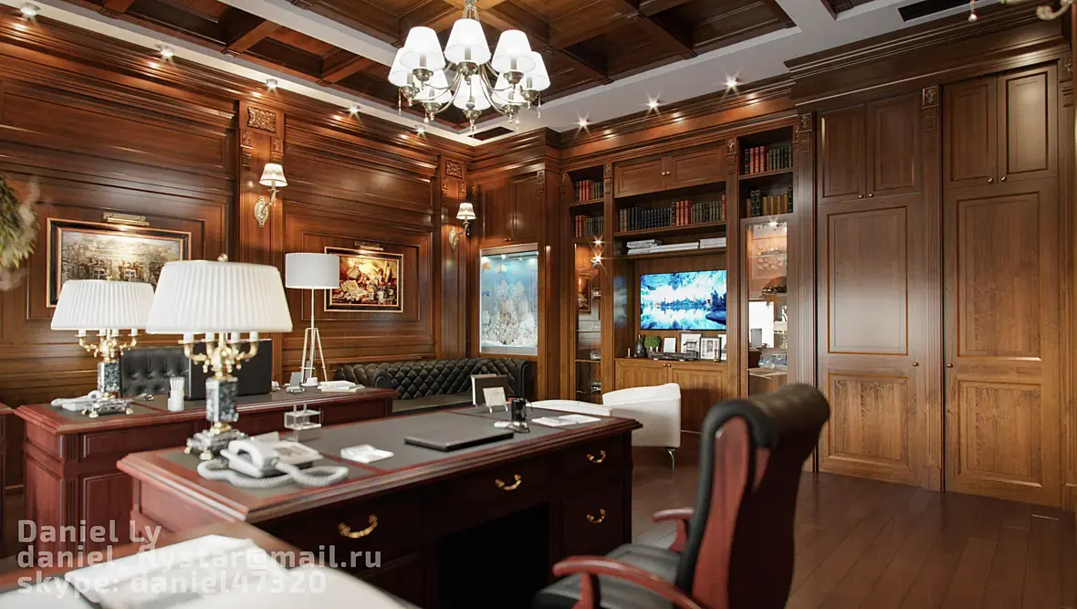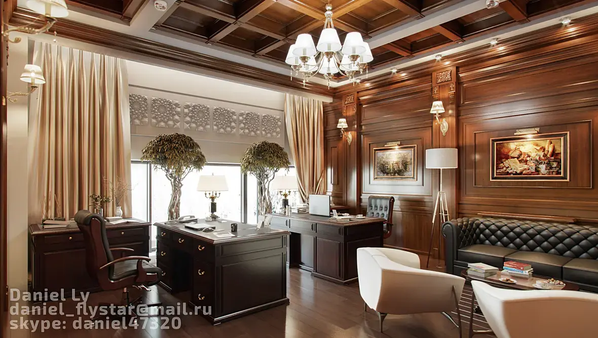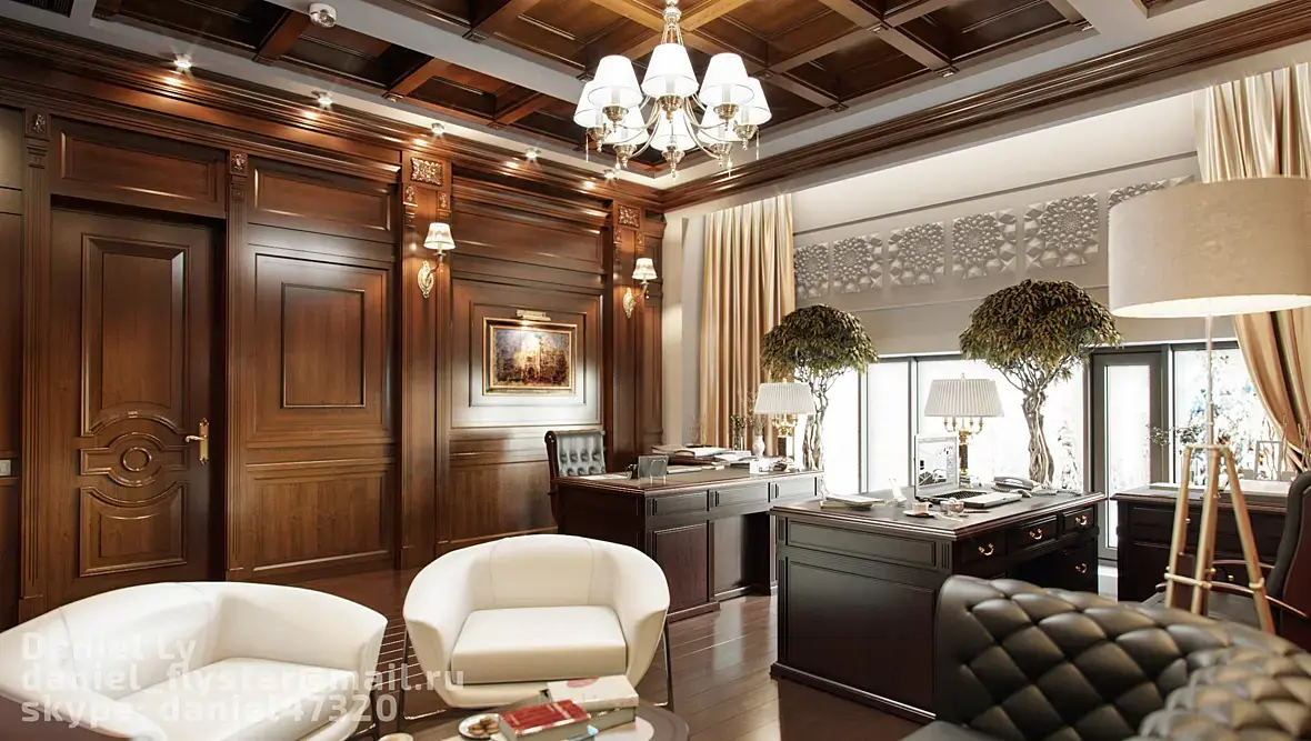 Вот мой пример, я делал дизайн кабинета для двух директоров, всем очень понравилось, может вам поможет. А вообще работу с заказчиком нужно начинать с аналогов, нужно полистать журналы и пусть определится со стилем. иначе это доение козла получается.