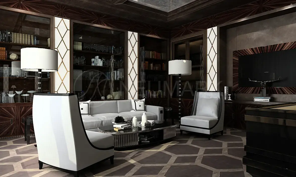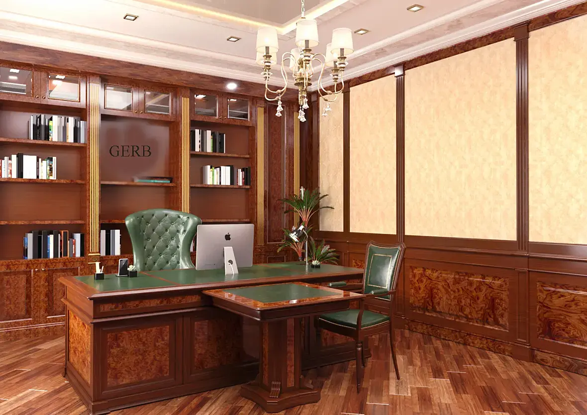 Думается что обязательный пункт в ТЗ "герб на стене" отметает подобные варианты. Ему нужна добротная классика. Покажите ему традиционные английские кабинеты с диванами "честер" и тд. Тут главное не говорите ему, что они английские, мало ли что у человека на уме, может он не выездной и у него сдвиг на фоне патриотизма.