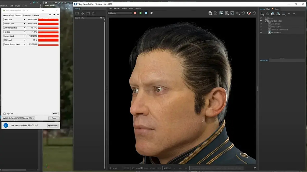 Сцена сьедает 10Гб видео-памяти и температура GPU - 70 градусов. Температура CPU от 65 до 68 градусов.
