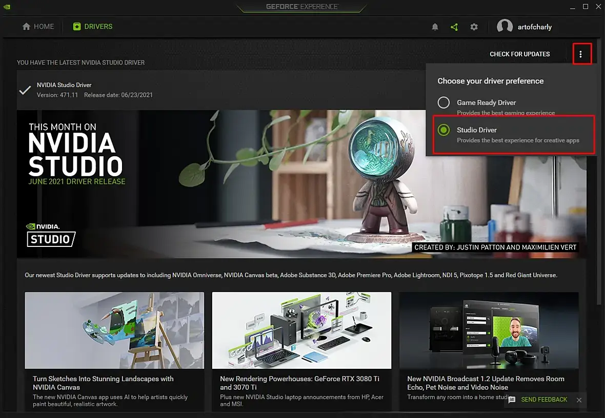 Переключиться на STUDIO драйверы можно в GeForce Experience.