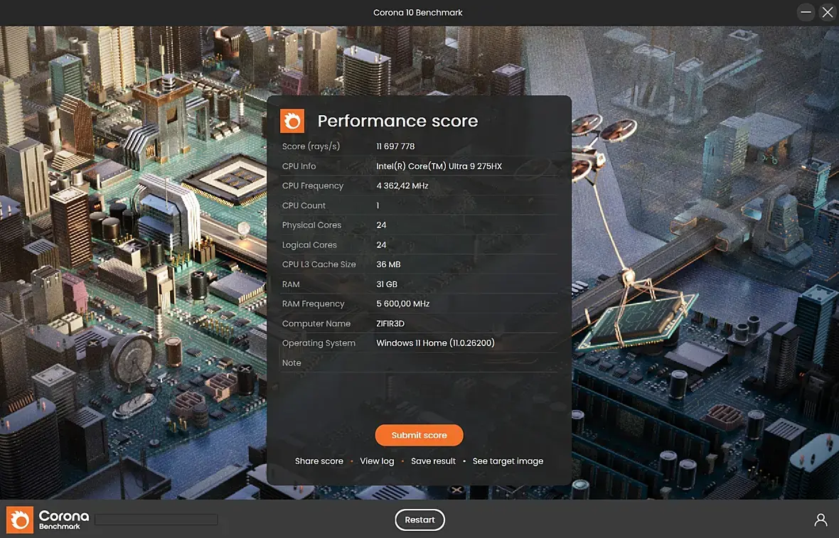 9 Ultra 275HX, Max 23, corona 12 update 2, производительный режим 3900 mhz, 88 град., 15 610 000 rays, time 17:19