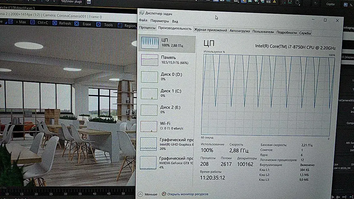 вовремя рендеринга когда температура процессора достигает до 75 градусов, она сразу снижает нагрузку на процессор где до 15%, и так опять таком же темпе продолжает, опускается разгоняется