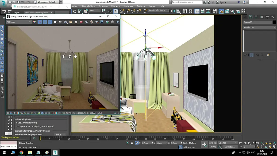 В симбиозе 3D Max 2017 и V-Ray 3.60.03, используя средние настройки рендера и среднее разрешение картинки из предлагаемых в настройках, получаеется более-менее нормальный рендер, где pass 30: