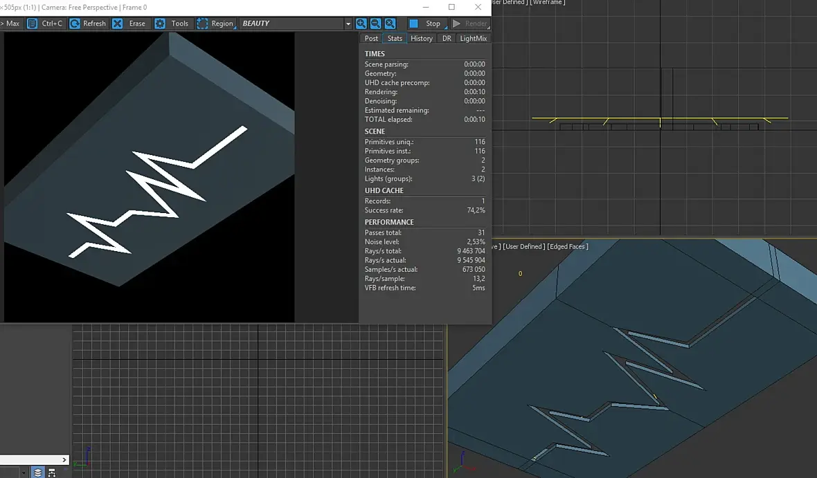 Я бы нарезал на плейне cut-ом нужную фигуру, а потом сделал чамфер. Потом перевёл бы в объём любым удобным способом. За объём спрятал бы прямоугольный источник света.