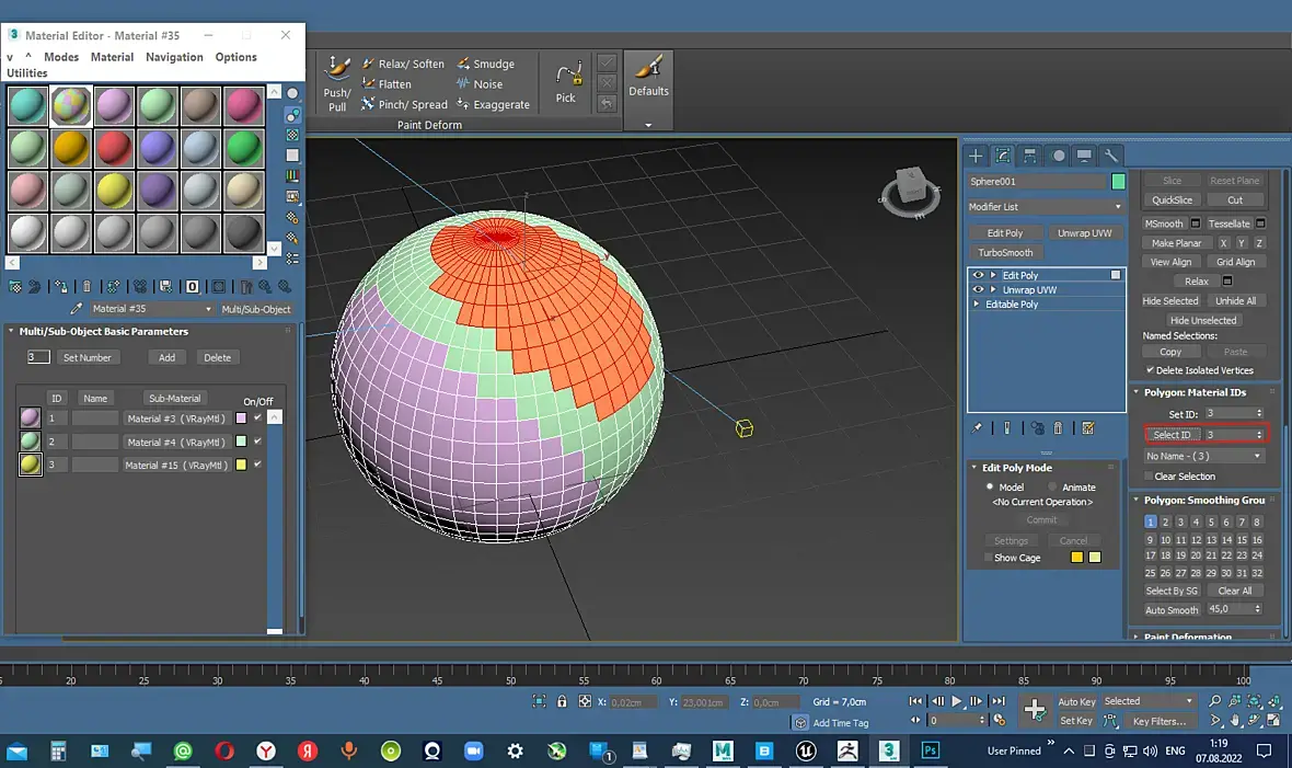 Обычно назначают UV развертку, (Модификатор Unwrap UWV) В мульти-суб-объекте автоматически назначается свой номер ID, поверх модификатора Unwrap UWV назначить модиф. Эдит Поли, и в нём уже по номерам выбирать полигоны