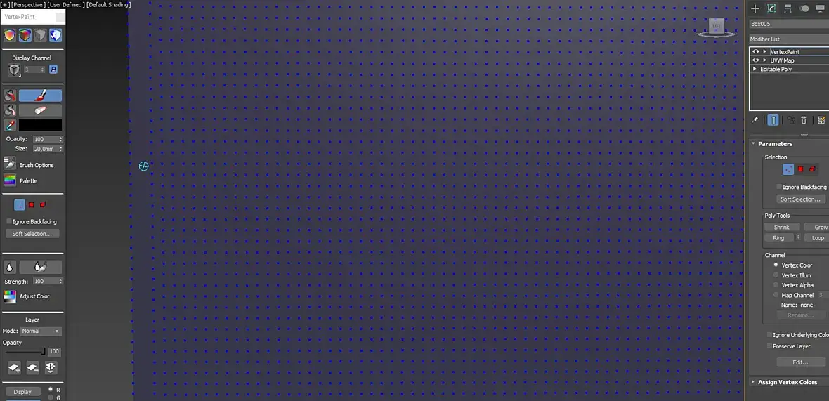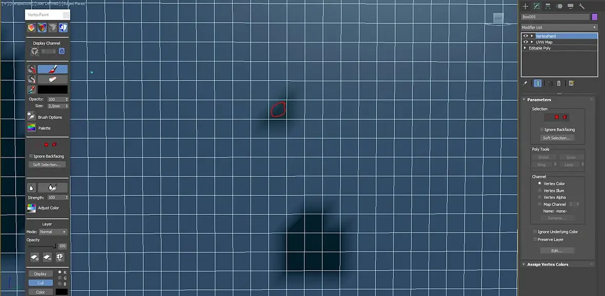 Коллеги, помогите, пожалуйста, разобраться с vertex paint. Первое - я правильно понял, что точность рисунка зависит от размера сетки? Проблема такая - я самой маленькой кистью тыкаю в один полигон, но он заполняется не только он, но и соседние, причем форма кисти какая-то странная - в виде наклоненной прямой. Вот тут в примере я кликнул по полигону в красном кружке ОДИН раз, но соседние тоже окрасились. Soft selection не включен. Другие параметры форму кисти не меняют. Мне нужно, чтобы заполнялись только те полигоны, по которым я провожу кистью.