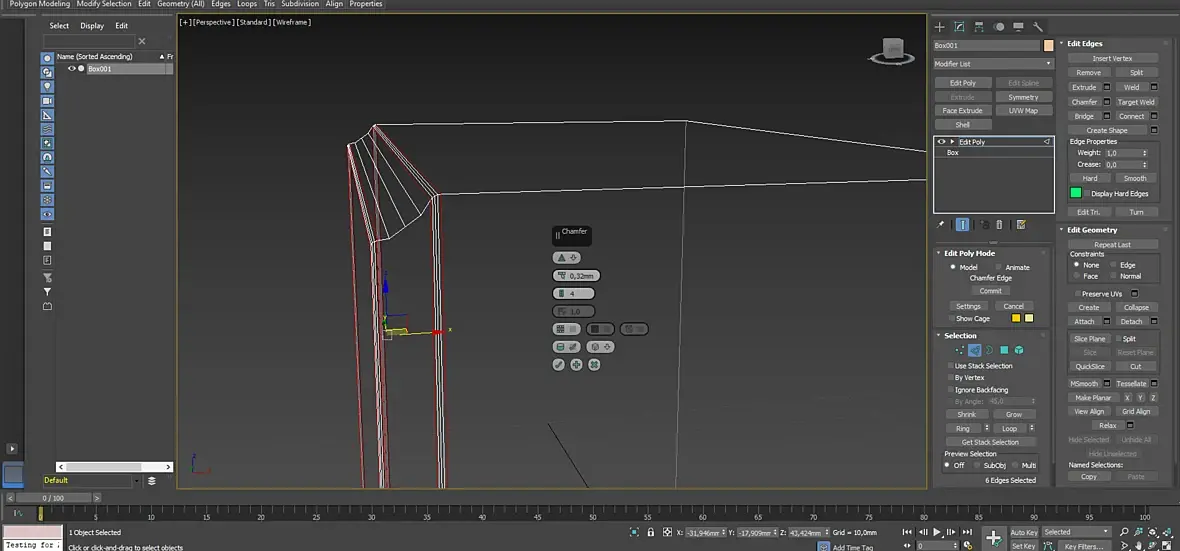 Создаем сплайн, экструдим, переводим в полигональный режим, выделенное чампферим.