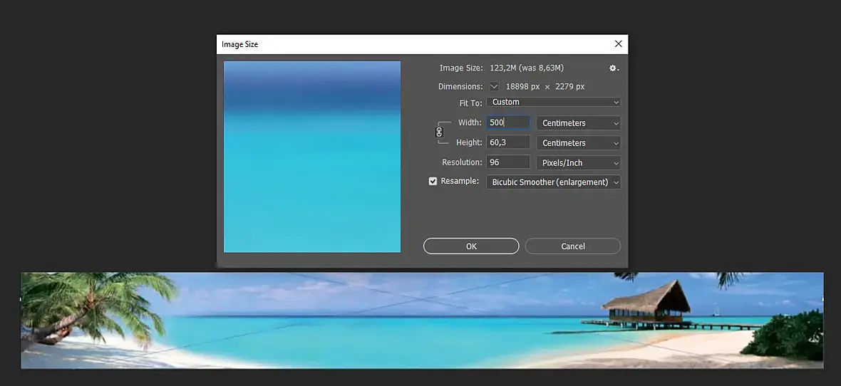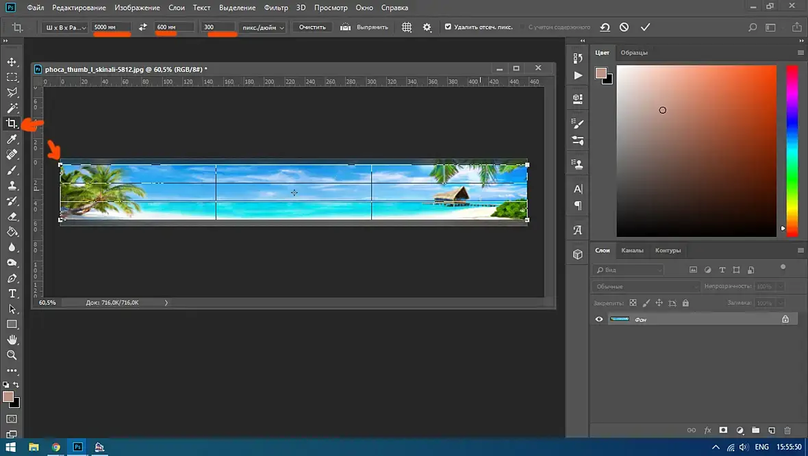 нажмите C в фотошопе. выберите вверху ш х в х разрешение, напишите туда 5000 мм х 600 мм х 300 dpi (можно и больше разрешение, если хоцца). рамкой откадрируйте изображение. гг изи вп.