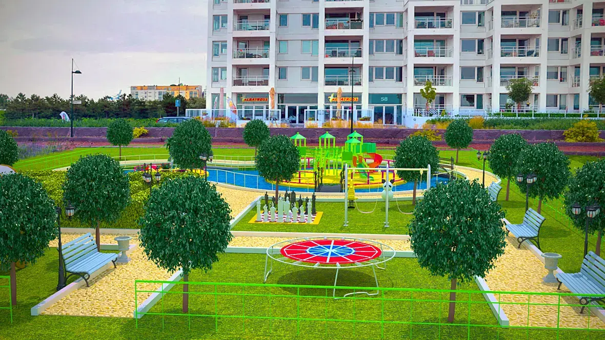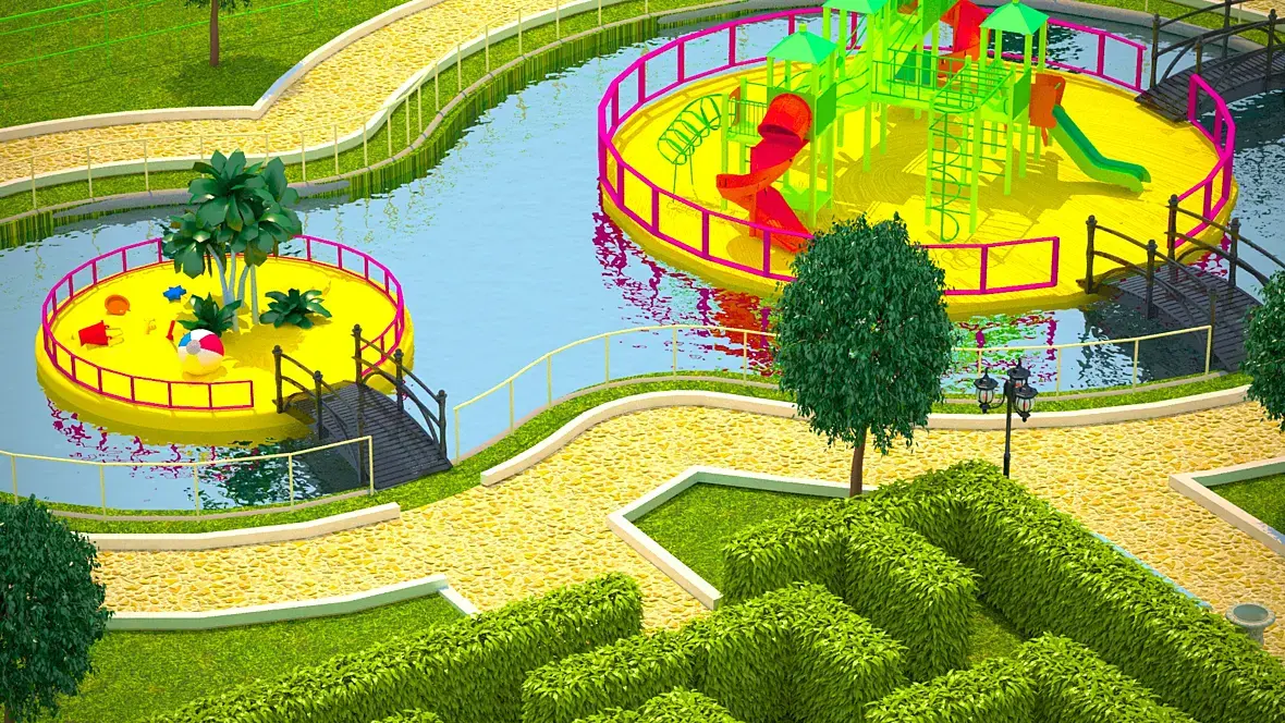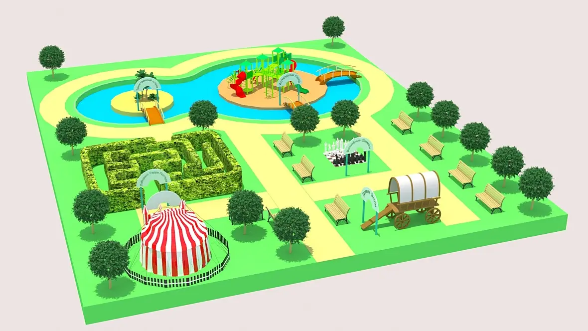 Комплекс - на сайте производителей каруселей выкладывают 3d файлы. Палатка, пальма, шахматы, лавка, дерево - сторонние. Лабиринт - это тоже сплайн с толщиной.