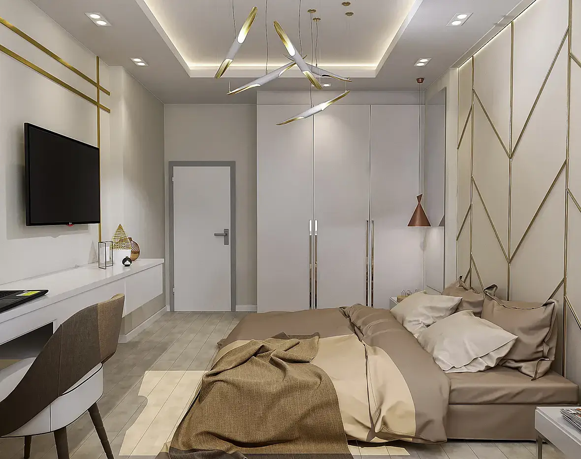 Автор, вам правильно насчет шкафа сказали. Подвиньте кровать со композицией на стене и тумбами плюс углубление потолка и люстру ближе к окну, тогда будет место для открывания. Нет смысла бороться за симметрию на стене, которая ничем не поддержана. И зеркала с тумбами можно ближе к оси кровати прижать, чтобы место выиграть.