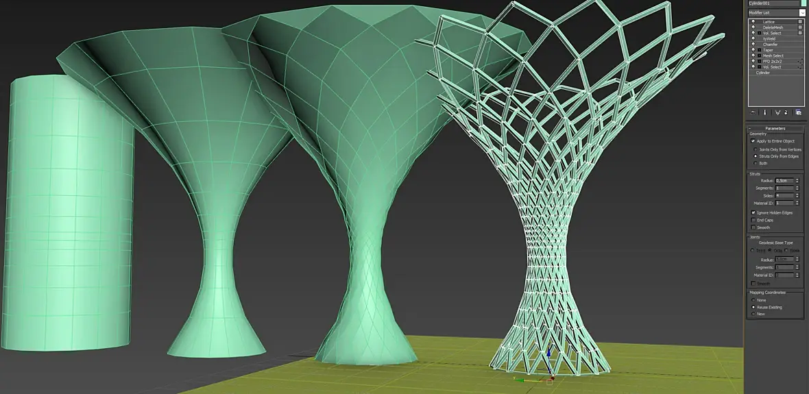 Создаете цилиндр, закручиваете, из вертикальных эджей делаете сплайны, зеркалите, и назначаете толщину, 1 минута работы
