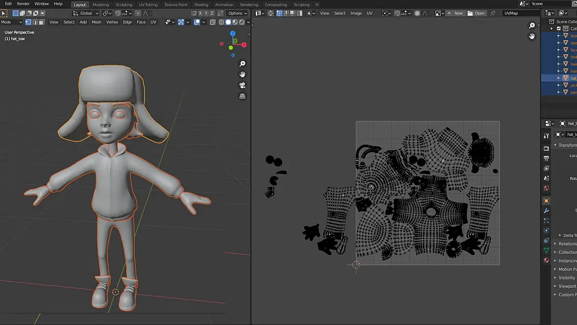 В чем еще может быть проблема? Развертку переделала, отступы оставила нормальные. Шапка, волосы и пр. у меня все отдельным мешем. На лоу поли и хайполи все проименовано с суффиксами. Одинаковое кол-во мешей.