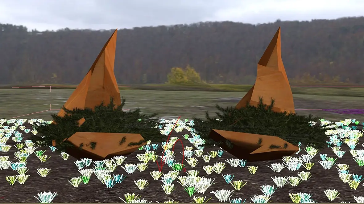 Как вариант нормали нужно перевернуть, трава может находится под плоскостью с обратной стороны. Может проверить свойства травы чтобы в object properties стояла галочка напротив renderable. Еще как вариант просто очень тяжелая трава и не влазит в вашу память, попробовать оптиммизировать, поставить отображение как box и проверить настройки скатерра.