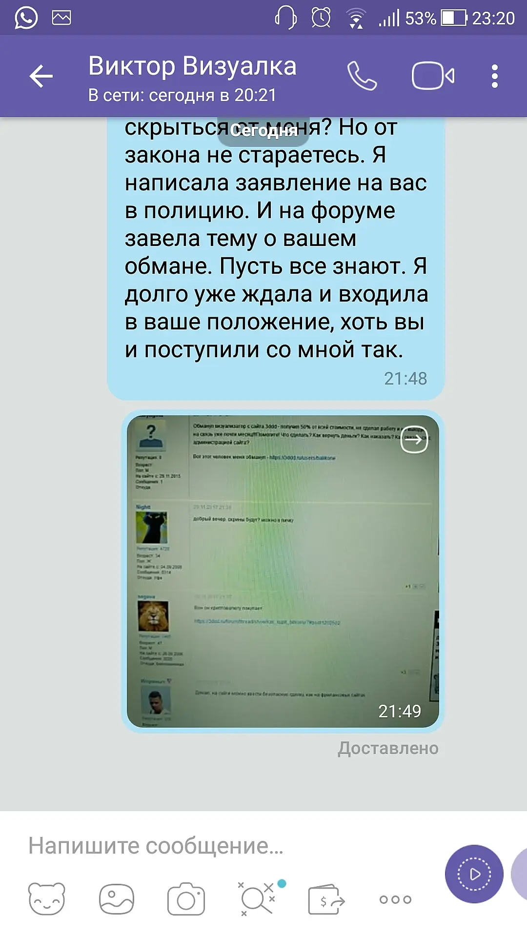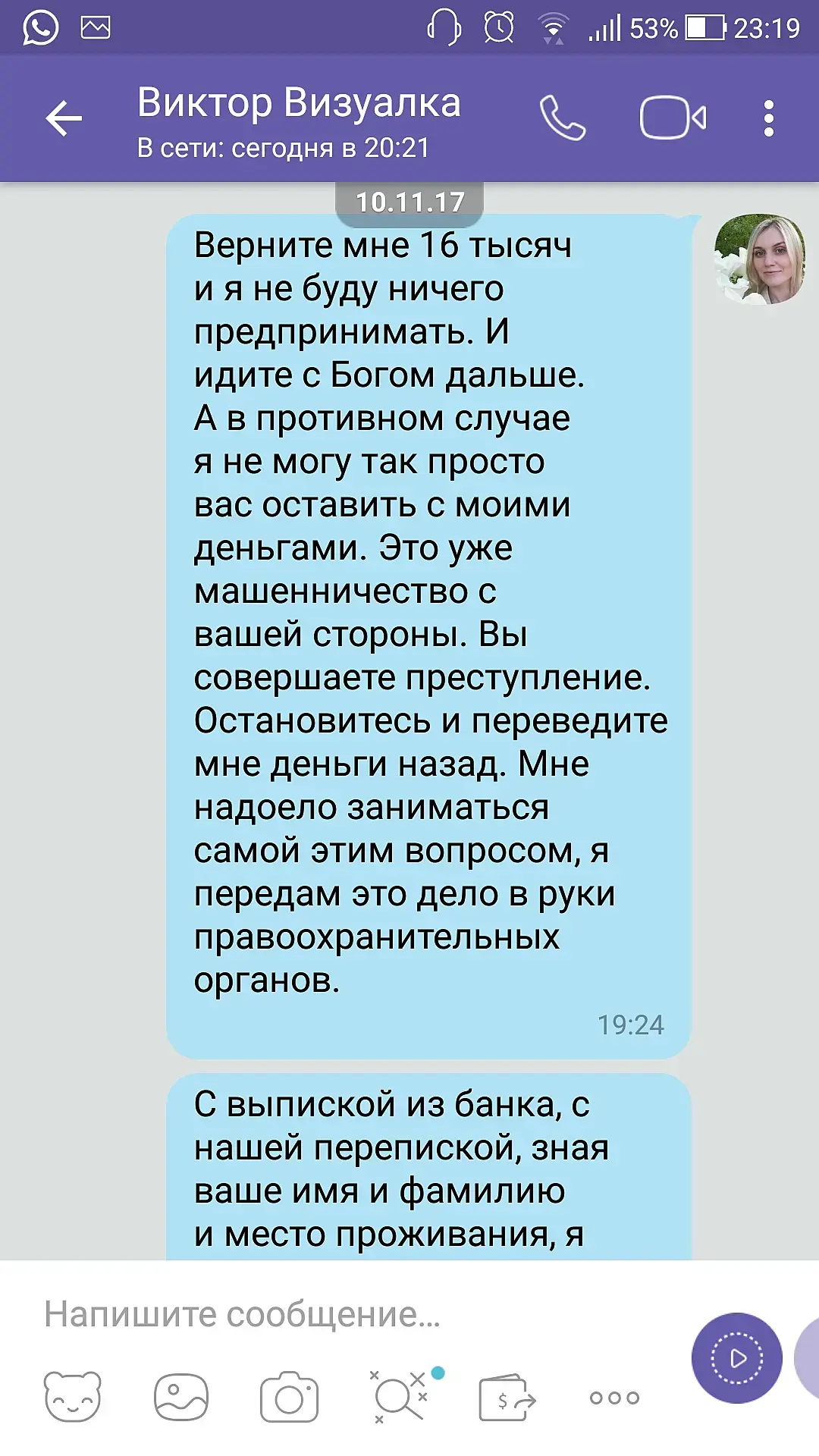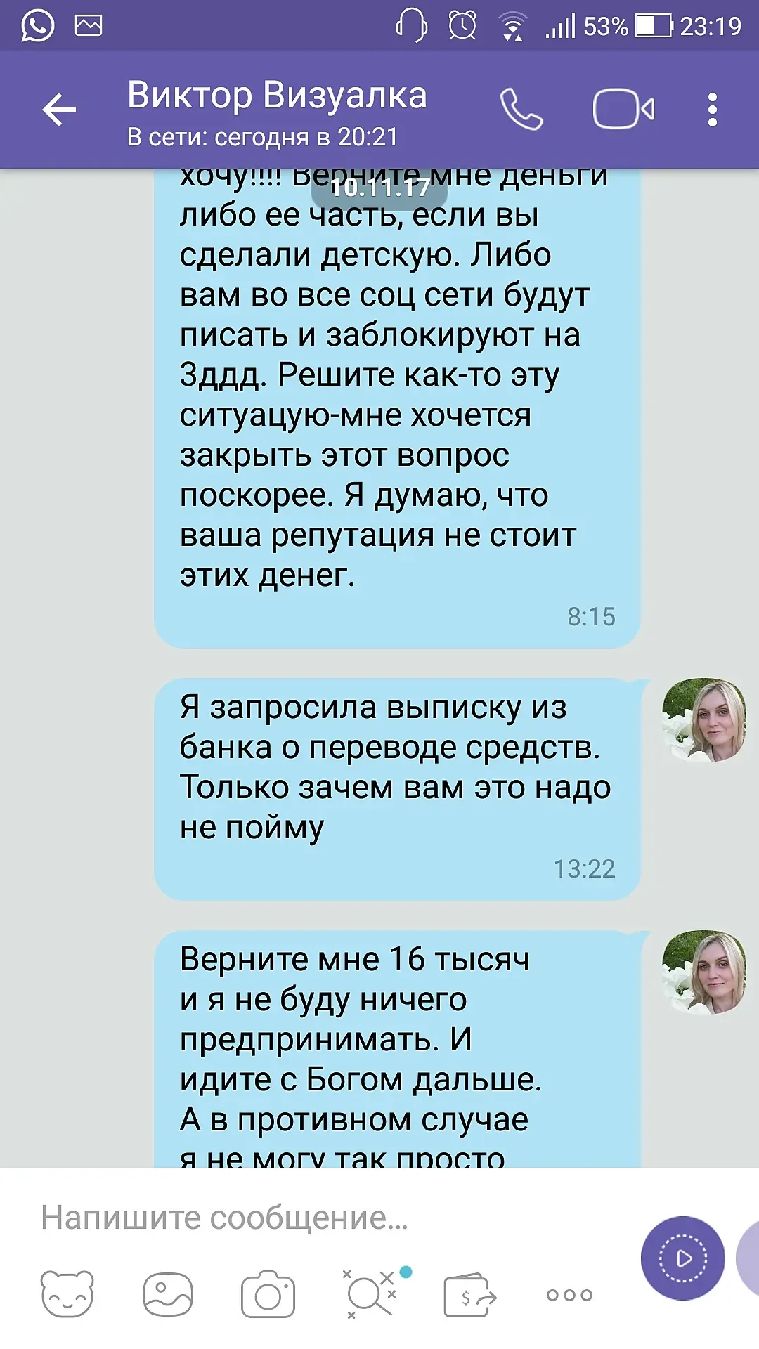 дала полный доступ к информации! хотела хоть какой-то реакции от обидчика - получила через этот форум! Извините - не задумывалась, что как-то обременю людей. Если не получится вернуть деньги, то ДААААА!!! я хоть подпорчу репутацию этому человеку. Но уж сколько можно быть белой и пушистой и думать с какого то фига о репутации этого человека))) Вам не смешно??? Если я оторвала вам от дел, то прошу прощения! И потом, у вам есть полное право не читать и не участвовать в данной дискуссии. Желаю вам плодотворного дня))