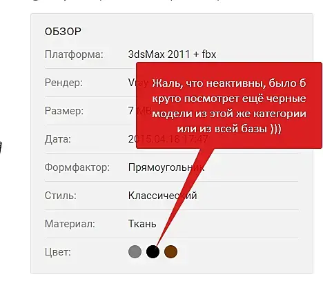 Насчет активности цвета тоже полностью поддерживаю - если он неактивный на странице, то непонятно зачем он там отображается: человек открыв модель уже увидел цвета модели. Было бы удобно если бы они стали активными - для поиска аналогичных моделей по цвету.