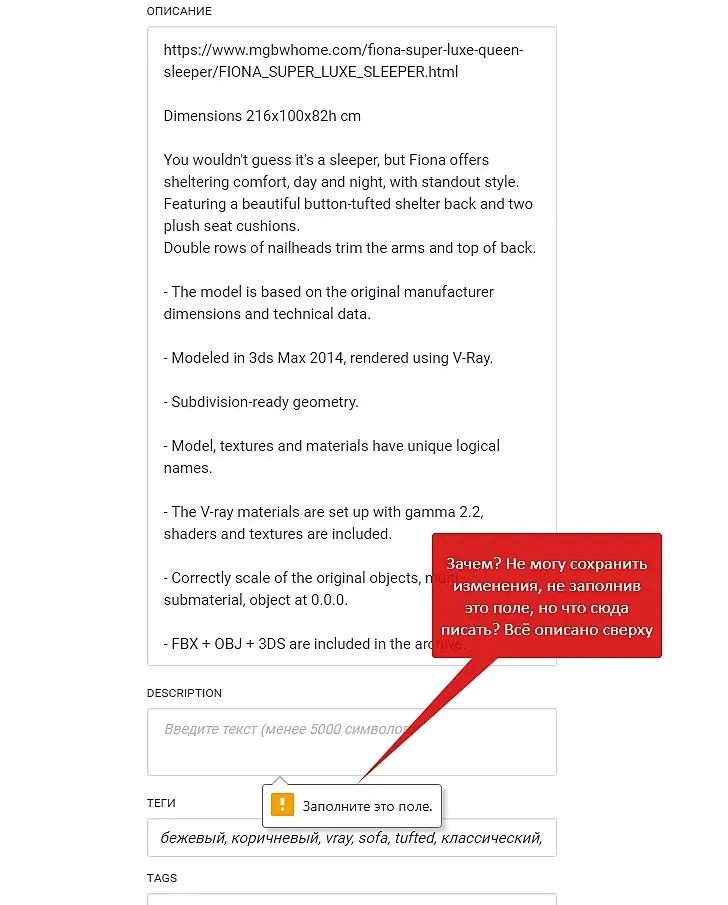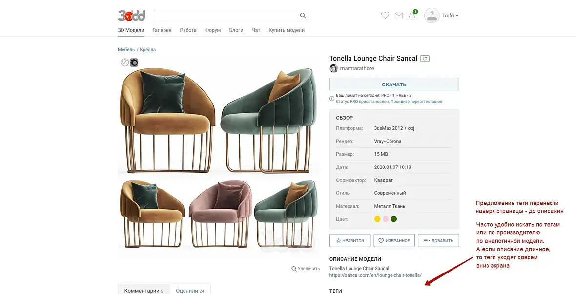 Так же предложение "для поиска аналогичных моделей". Раньше было удобно искать по тегам: по производителю и т.п. А теперь теги убрали вниз под Описание и они не на виду. Предложение Тэги вернуть вверх, чтобы удобнее было искать дополнительные модели. А то получается - тэги есть, но чтобы ими воспользоваться нужно проматать вниз страницы