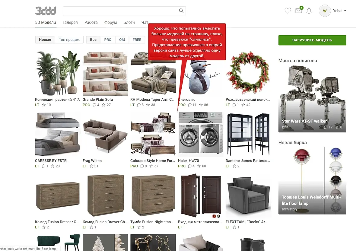 Просто интересно будет ли здесь когда нибудь нормальная статистика...там сводки всякие, графики, как на других сайтах. Етот же не самый бедный. Почему же не сделать? Я например хочу видеть сколько у меня скачали а сколько купили. И видеть ето все как на ладони. А не проводить расследования типа зайди туда а потом туда, найди модель... посчитай...отними...купи у себя сам. Так не работает когда у тебя 2к+ моделей...Там не найти ничего ни в етой статистике покупок ни саму модель не найти...Если забить ее в поиск то статистика по ней не видна...Ето для чего сделано? чтобы что? Почему я не вижу кто скачал модель? Я не знаю скачали мою модель или купили а деньги не пришли. Все очень непрозрачно и мутно. Может все чесно а может и нет...А может деньги неприходят изза какогото очередного косяка... Репутация же както поломалась и приходила не за каждую загруженную модель. Может и с продажами не все впорядке. Вобщем думаю не у меня одного возникают вопросы.