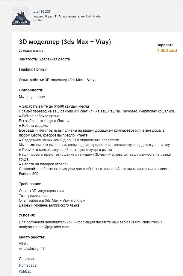 это не вакансия. Это админы CGtradera предлагают вам моделить и продавать у них на стоке. 1000$ это не зарплата, а ваш потенциально возможный доход с продаж.