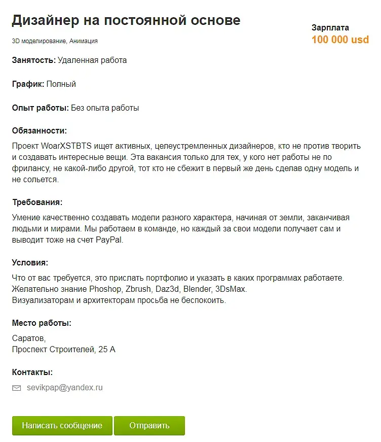 У меня нет какого-то определенного отношения к таким вакансиям. Если чел аккуратно платит за сделанную работу, то почему нет? Но сам я вряд ли бы на такую откликнулся )