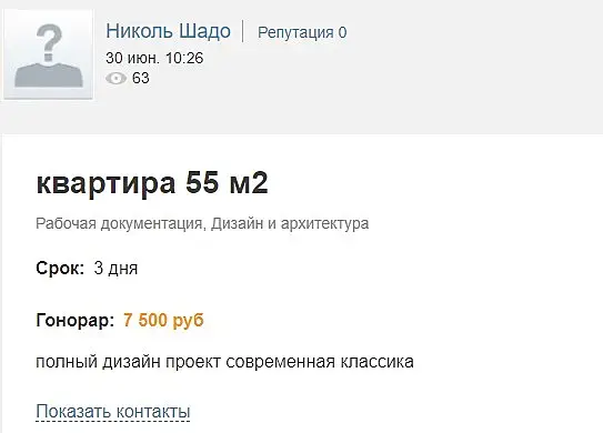 Там, кстати, кто еще не видел - новый жирный проект от Шадо подоспел. Дизайн с рабочкой и визом по 136 рублей и 36 копеек за квадрат. Налетайте, пока не разобрали: