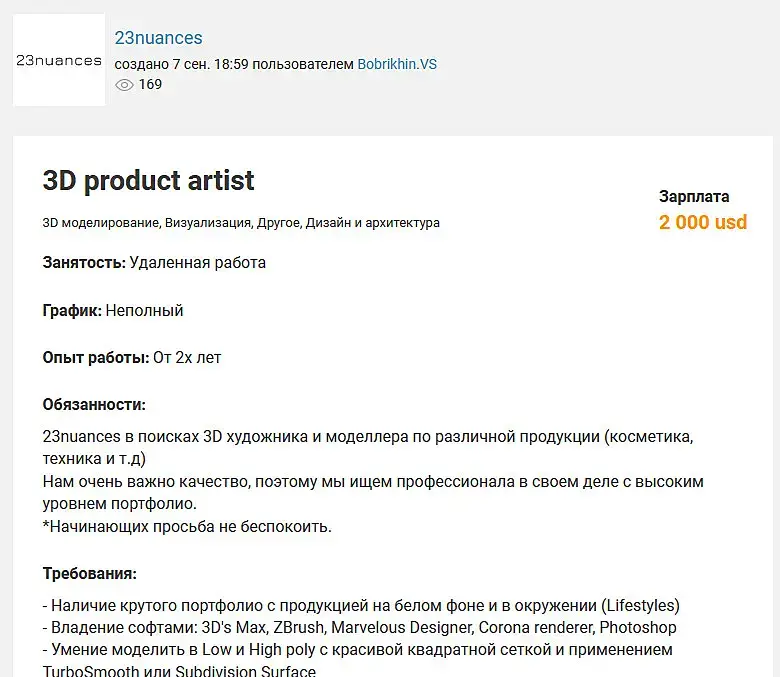 такие же как и Renderthat. Точно такая же шарага. Сыпят типа тестовыми, а по итогу "ой вы не справились". Кто бы сомневался, и тут же предлагают тестовое другого типа. Всё, что сейчас за баксы или евро и для моделлеров, то лохотрон 1000%. Nfnite уже загадили и тут и на НН, нормальных вакансий среди этого мусора не видно. Приходится пользоваться "исключить слова". Тогда оказывается среди 20 вакансий только 2. Я ни сколько не преувеличиваю, это спам и место им в бане.