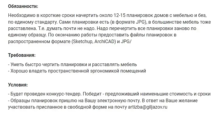 Ахаха - вот еще один персонаж АртИзба - предлогает начертить 12-15 планировок в сжатые сроки и за 10.000р / но при этом провести еще конкурс - кто еще дешевле и быстрее предложит)))Желаю АртИзбе чтобы у них дома по такой же системе покупали - Качество и Сроки чтоб не страдали, а по Цене заказчики у них соглашались если они только за самый минимум готовы строить - за миску супа)))