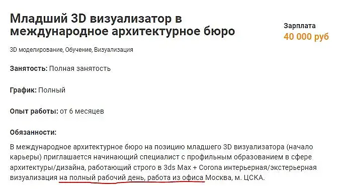 Меня на днях пригласили на должность визуализатор с окладом 160тыс рублей. Сказали, есть одно условие, вы должны выполнить тестовое задание. Оно не оплачивается. Надо собрать сцену коттеджа 280 квадратов, разместить в ней всю мебель, декор и отрендерить. Если нам понравится, ты мы будем с вами работать на постоянной основе. Я отказался. Это была нее на этом сайте конечно. Так для размышлений.