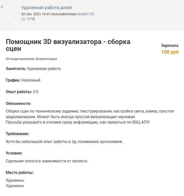 Было наверное. Но я листая вакансии чет орнула. Старое правда, но все равно орнула. Как за хлеб и воду, выполнить всю работу за визуализатора, и при этом остаться в рядах всего лишь помощника. Просто сама сейчас хочу податься в подмастерья на сборку сцен, и тут подумала... та не, орнула просто)))