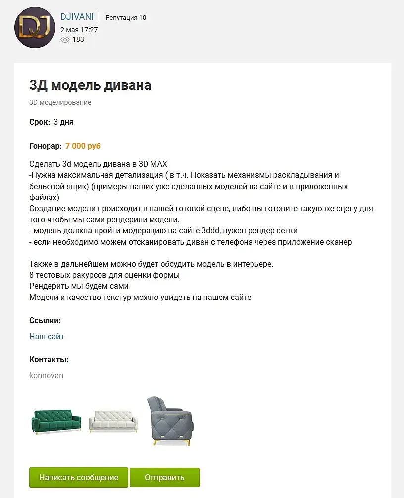a.k_3d, если можно работать меньше, а заработать больше, то почему нет? В принципе ,я не против этих расценок ,если это устраивает. Мне было интересно справедливая ли цена не более, т.к. я заказываю у моделлеров в том числе +- похожие диваны и у меня подобный стоил бы 13-16К при более легком ТЗ, там только что полигонаж ограничен. Судя по отзывам можно спокойно платить меньше и найти ребят ,кто будет делать это за 7К ,а я буду себе брать комиссию не 20% ,а 50 =)