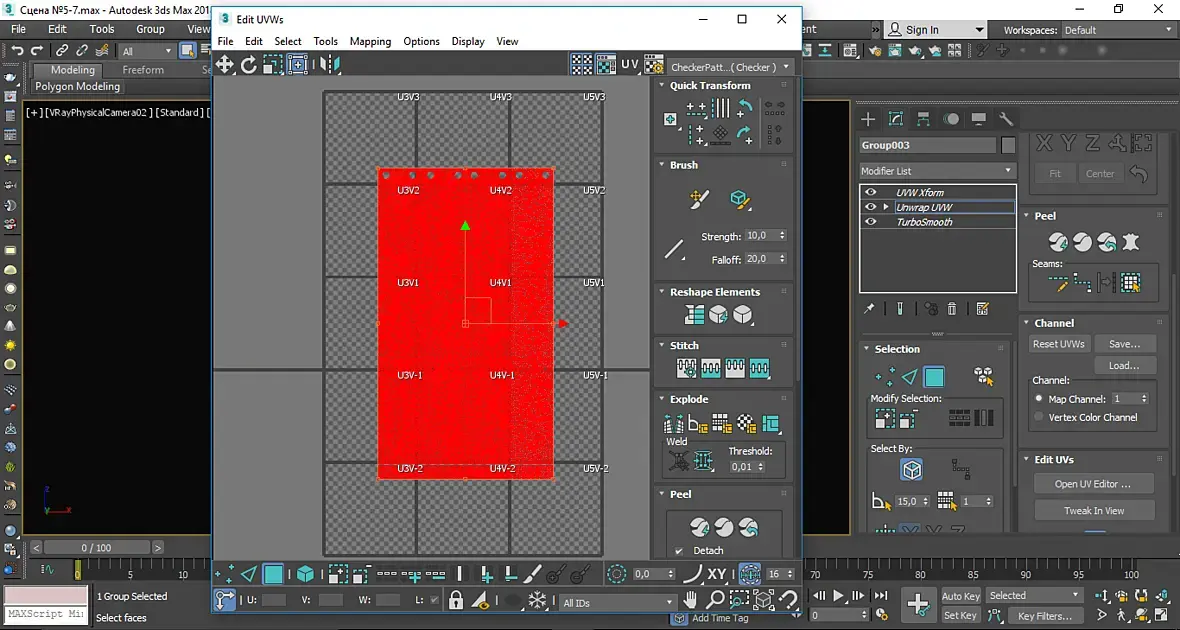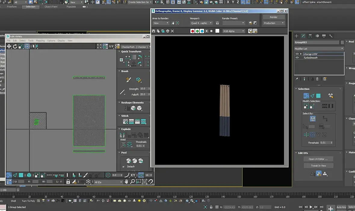 Попробуйте так: Накидываете Unwrap UNW, правите развёртку, как вам надо, затем переходите в режим полигонов выделяете все и накидываете UNWxform. Там выставляете нужные параметры и коллапсите стек. Потом турбосмус и рендер.